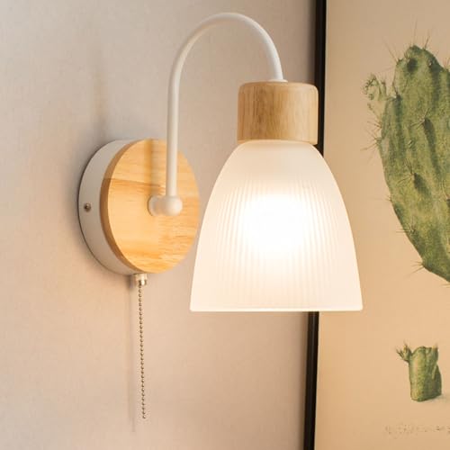 GZZBMY Interieur Applique Murale avec Interrupteur Tirette Retro Metal Lampe Murale E27 Rond Verre Abat Jour Decoration Éclairage Mural Bois Léclairage Luminaire pour Chambre Coucher (Blanc,1 Pièce)