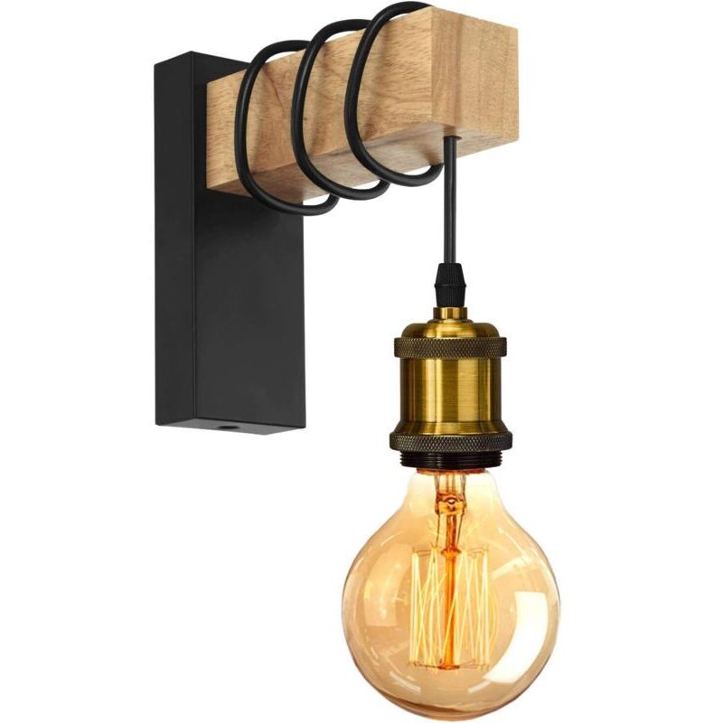 Applique Murale Intérieur Vintage Industrielle Lampe Murale E27 Luminaire Abat-jour en Métal avec Support en Bois pour Salon Couloir Bar (Noir)