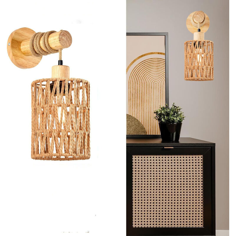 Applique murale d'intérieur vintage, abat-jour rétro en corde de chanvre E27 avec poutres en bois, applique murale d'intérieur avec interrupteur pour