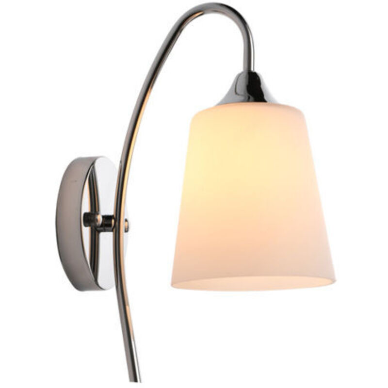 Applique murale type E14, finition chromée, abat-jour blanc, dimensions 25 x 15 x 28 cm, idéale pour éclairage décoratif.
