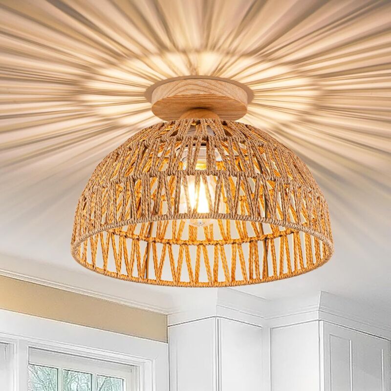 Plafonnier Rotin pour Salon – Lampe de Plafond E27 avec Abat-Jour en Rotin, Décoration Maison Style Vintage Campagne, Pour Chambre, Couloir, Beige
