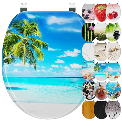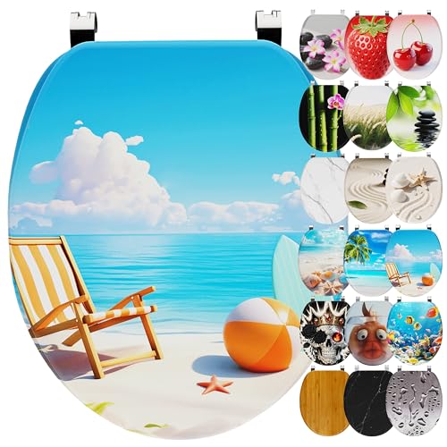 Ribelli Abattant de WC avec système d'abaissement automatique - Couvercle de toilette en forme de O - Nombreux motifs - Montage facile - Facile à nettoyer - Environ 46 x 37 cm - Plage de mer