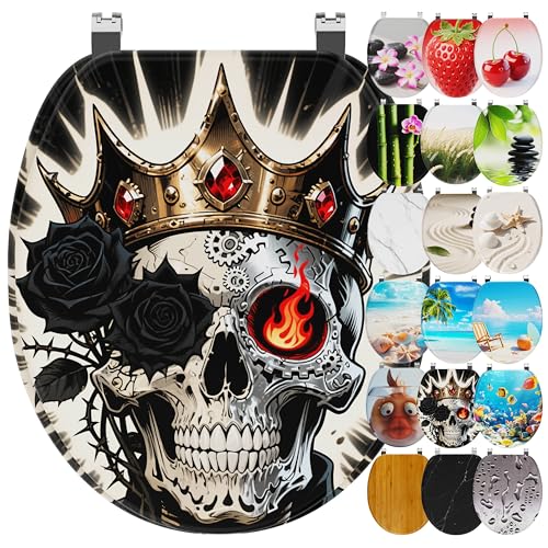 Ribelli Abattant de WC avec système d'abaissement automatique - Couvercle de toilette en forme de O - Plusieurs motifs - Montage facile - Facile à nettoyer - Environ 46 x 37 cm - « Roi tête de mort