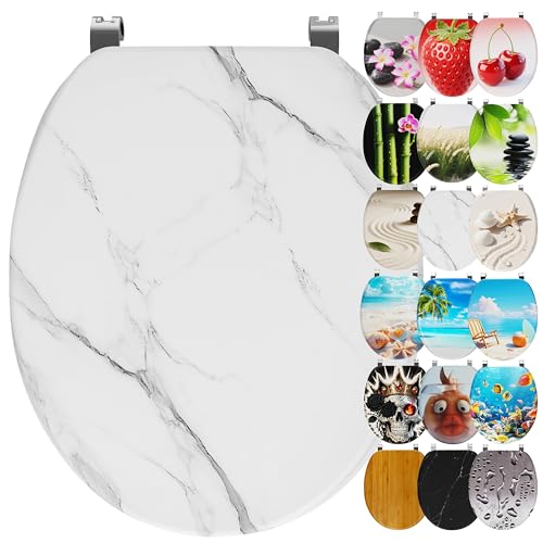 Ribelli Abattant de WC avec système d'abaissement automatique - Couvercle de toilette en forme de O - Nombreux motifs - Montage facile - Facile à nettoyer - Environ 46 x 37 cm - Marbre blanc