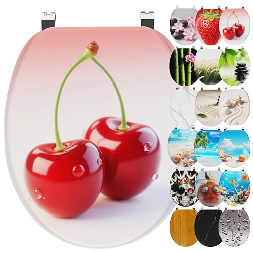 Ribelli Abattant de WC avec système d'abaissement automatique - Couvercle de toilette en forme de O - Nombreux motifs - Montage facile - Facile à nettoyer - Environ 46 x 37 cm - Cerises