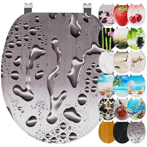 Ribelli Abattant de WC avec système d'abaissement automatique - Couvercle de toilette en forme de O - Nombreux motifs - Montage facile - Facile à nettoyer - Environ 46 x 37 cm (gouttes d'eau gris)