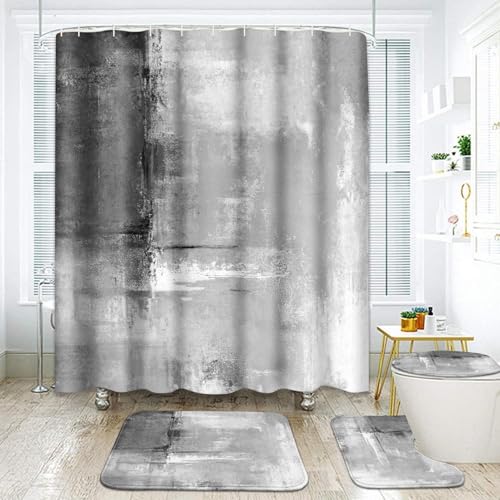 ArtSocket Lot de 4 Accessoires Salle de Bain Rideaux de Douche Gris Abstrait Peinture Noire et Blanche avec Tapis Antidérapant pour Abattant de WC et Tapis de Bain 182,9 x 182,9 cm