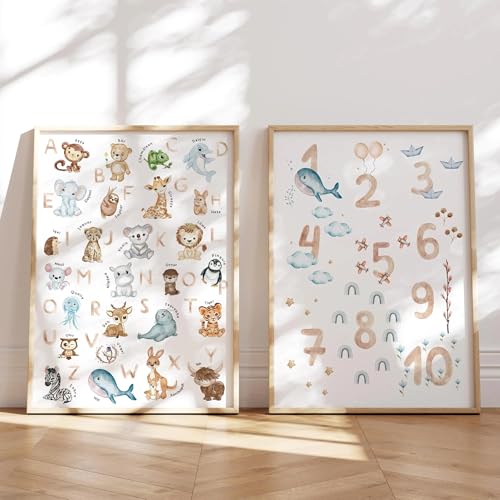 MeinBaby123® Lot de 2 affiches A4 pour chambre d'enfant,Alphabet ABC,Poster d'apprentissage avec animaux,Affiche murale de qualité supérieure (alphabet et chiffres,Lot de 2)