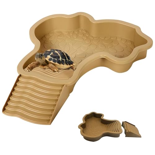Wuvfojca Piscine Tortue Terrestre Mangeoire ABS Abreuvoir Tortue Terrestre avec Rampe 35x28,5x4,3 Cm Bassin d'eau pour Tortues Plat d'alimentation pour Reptiles Lézard Jaune Brunâtre Aquarium