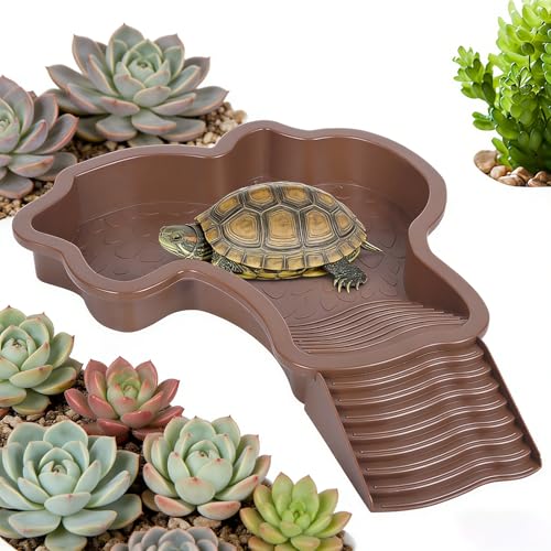 MEISO Abreuvoir Tortue Terrestre, Plat d'eau Bassin pour Tortue de Piscine avec Rampe, Bol d'eau pour Reptiles avec Échelle, Mangeoire Tortues Terrestre, pour Tortues, LéZards Et Gecko (Brown)