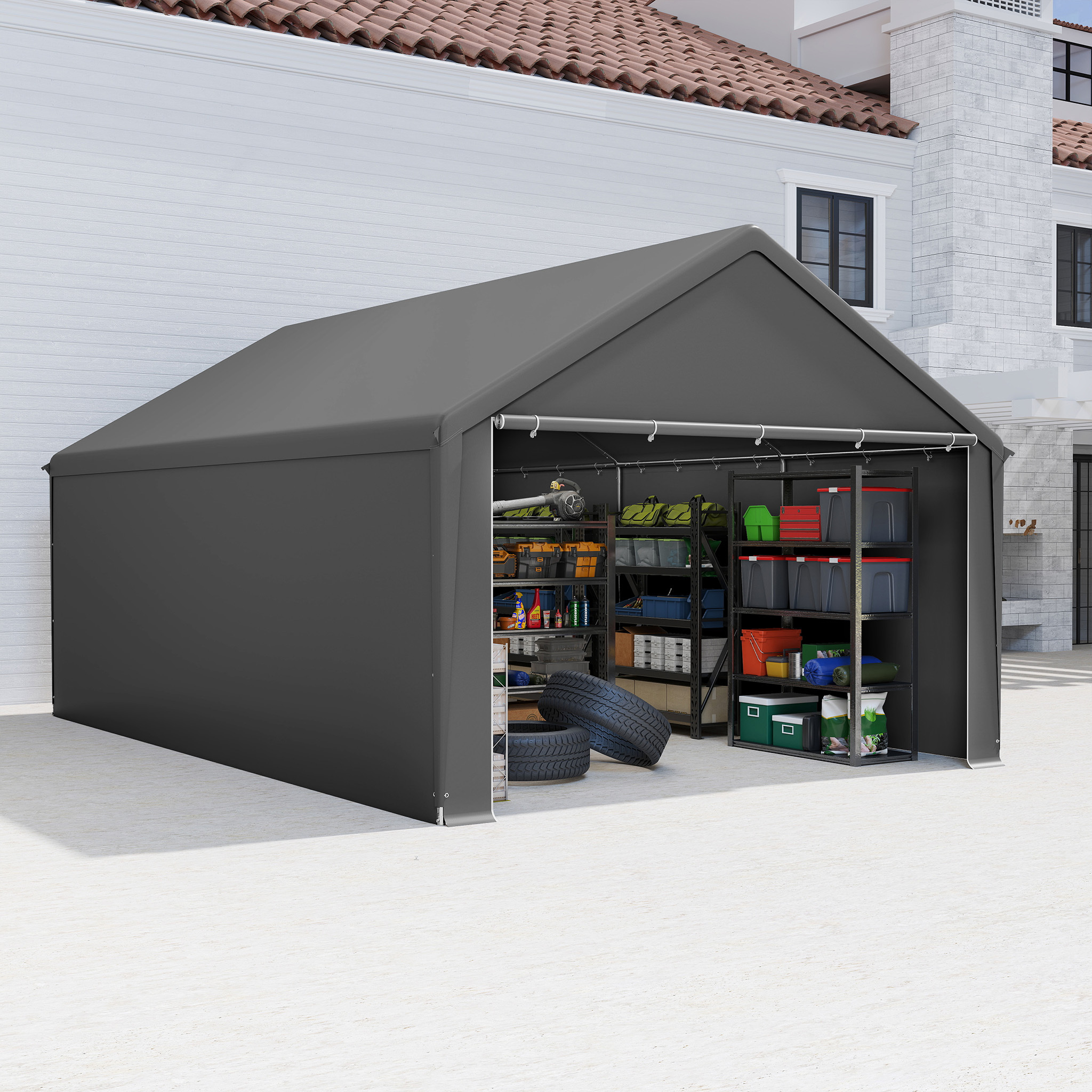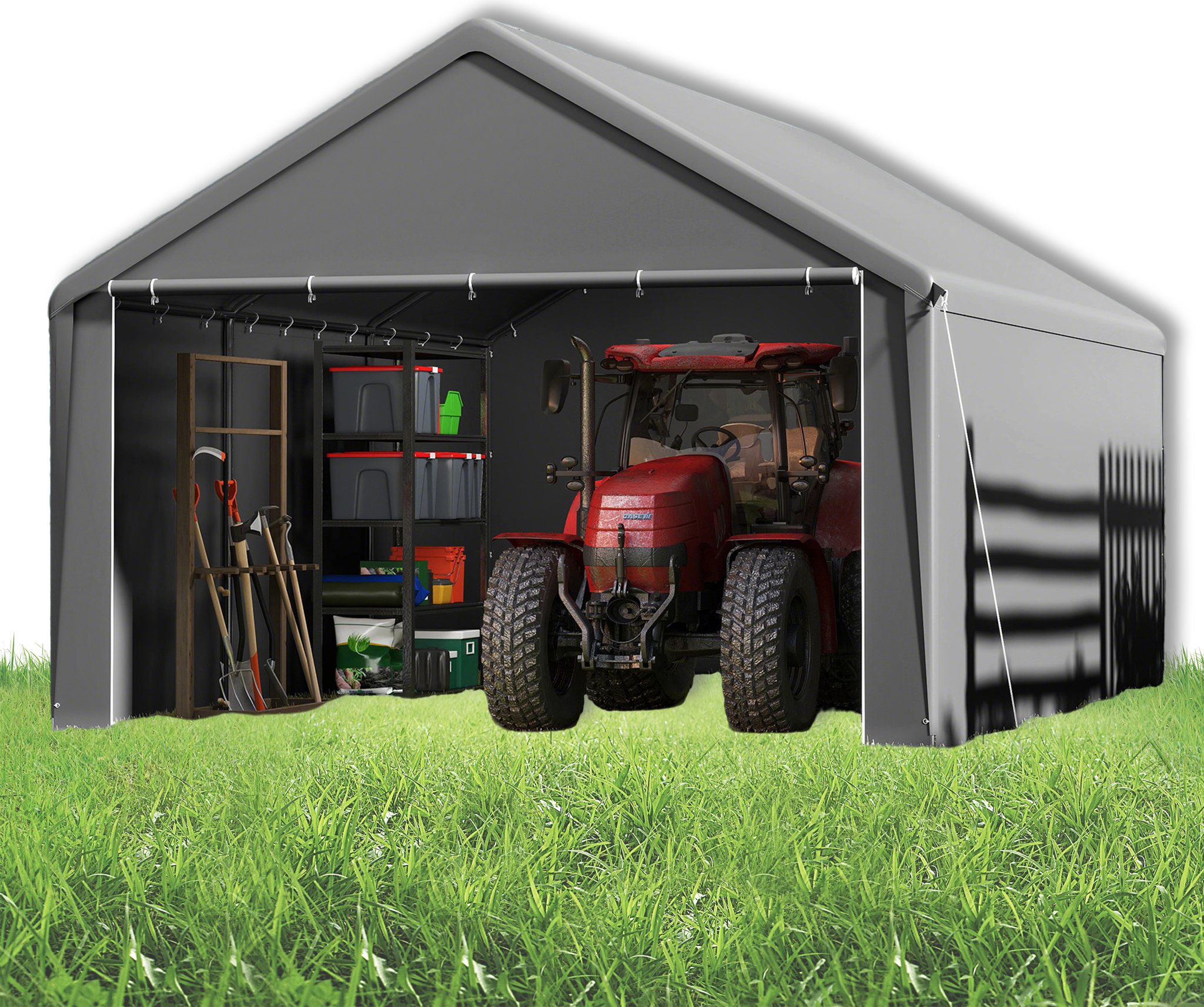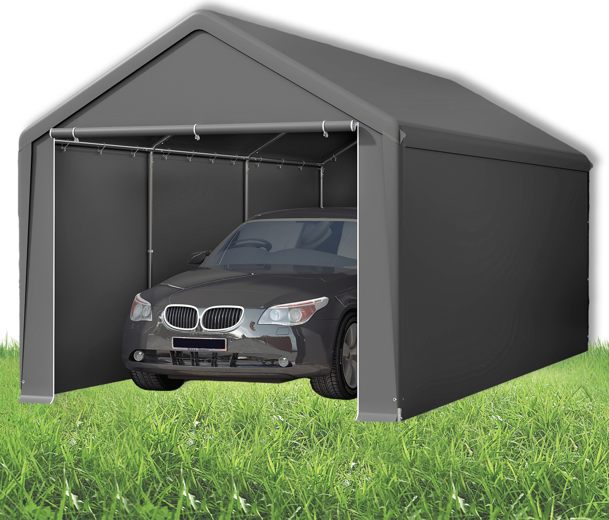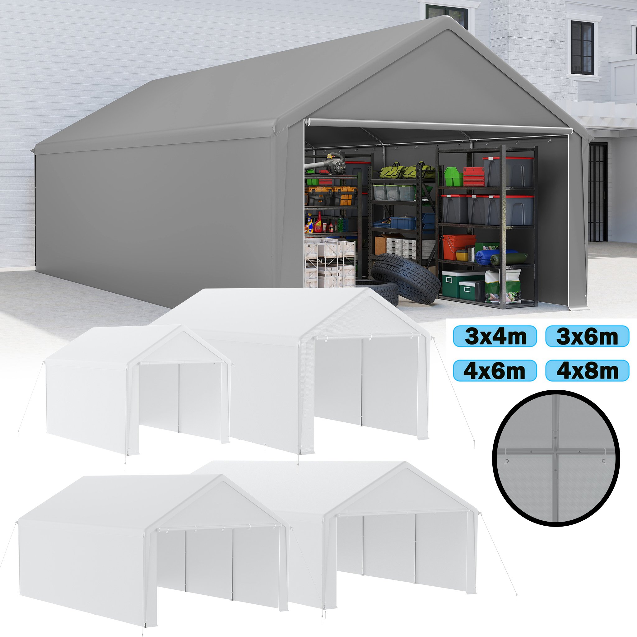 LARS360 Carport gris 4x8m & tente de stockage - Garage en toile résistant aux intempéries avec toit en PE résistant aux UV pour voiture, SUV, camion & bateau - Abri de garage pour jardin & cour