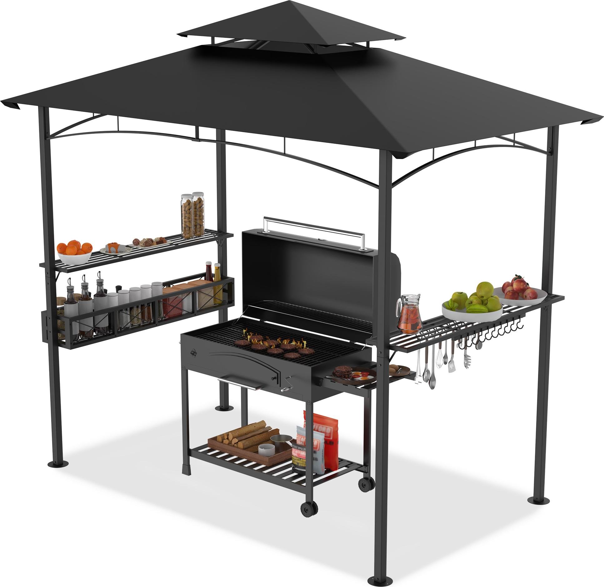COSTWAY Pavillon de barbecue avec double toit, étagères latérales, panier métallique, crochet & ouvre-bouteille, abris pour barbecue résistant aux intempéries, 242x153x250cm Gris foncé