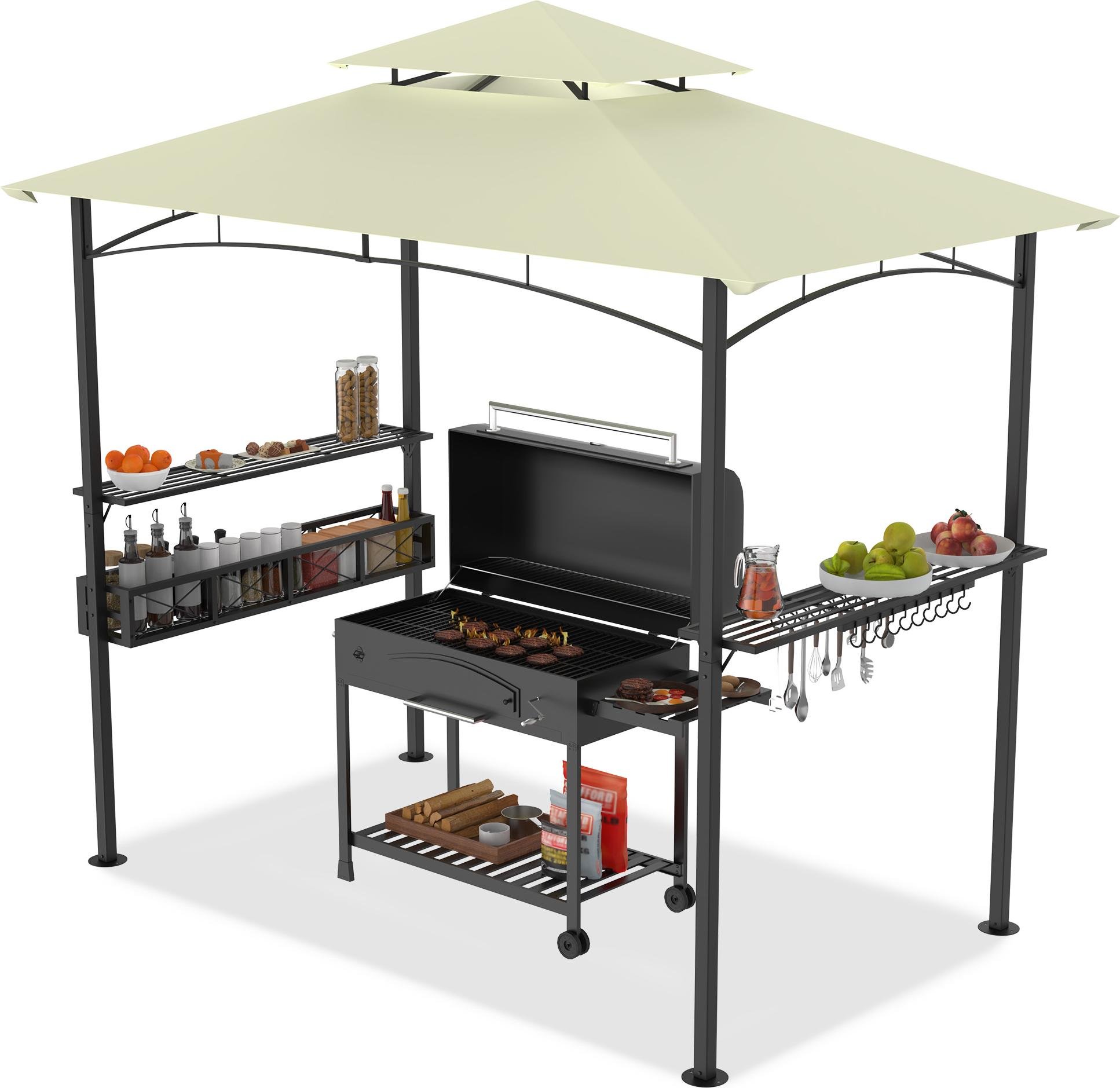 LZQ Pavillon de barbecue avec double toit, étagères latérales, panier métallique, crochet et ouvre-bouteille, abris pour barbecue résistant aux intempéries, 244 x 153 x 250 cm,Beige