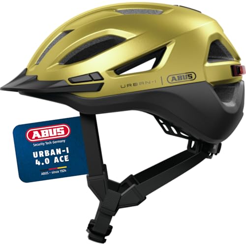 ABUS Casque urbain Urban-I 4.0 ACE - Casque de vélo avec feu arrière rechargeable, 4 modes d'éclairage, visière, et fermeture magnétique - pour adolescents, femmes et hommes - taille L, jaune