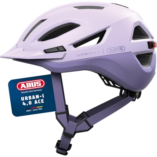 ABUS Casque urbain Urban-I 4.0 ACE - Casque de vélo avec feu arrière rechargeable, 4 modes d'éclairage, visière, et fermeture magnétique - pour adolescents, femmes et hommes - taille S, violet