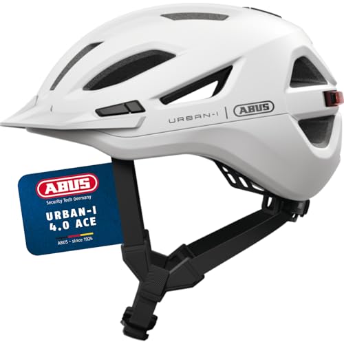 ABUS Casque urbain Urban-I 4.0 ACE - Casque de vélo avec feu arrière rechargeable, 4 modes d'éclairage, visière, et fermeture magnétique - pour adolescents, femmes et hommes - taille M, blanc