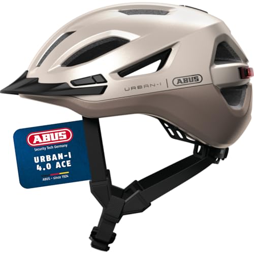 ABUS Casque urbain Urban-I 4.0 ACE - Casque de vélo avec feu arrière rechargeable, 4 modes d'éclairage, visière, et fermeture magnétique - pour adolescents, femmes et hommes - taille S, beige