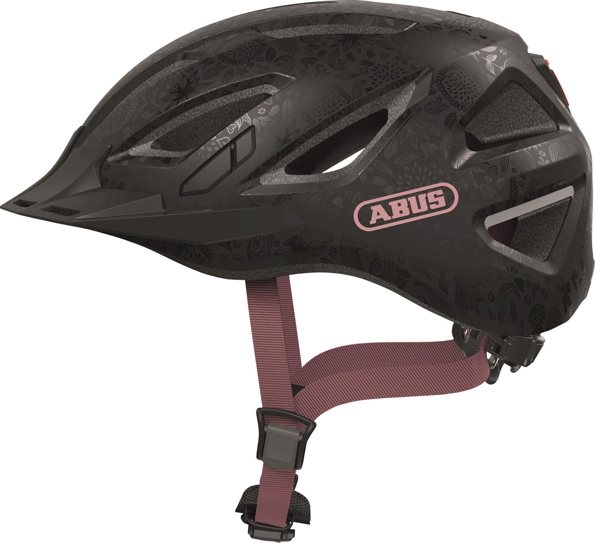 Casque de ville ABUS Urban-I 3.0 - casque de vélo avec feu arrière, visière et fermeture magnétique - pour femmes et hommes - noir avec motif floral, taille M (52-58 cm)