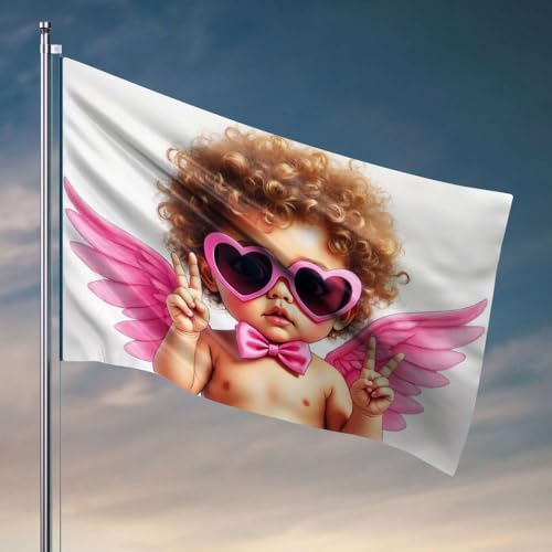 Drapeaux graphiques pour chambre de bébé avec cheveux bouclés, lunettes de soleil en forme de cœur rose et ailes d'ange. Décorations de porche, accessoires de chambre d'extérieur pour homme (152 x 244