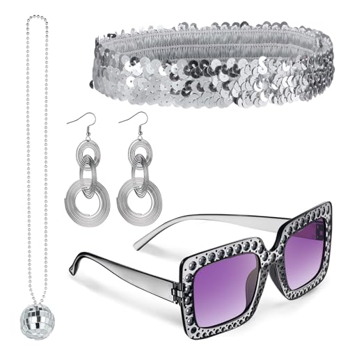 Accessoires Costume Disco 4 Pièces Disco Accessoires Femme Déguisement Année 70 Boucles d'Oreilles Lunettes Bracelet Collier pour Vêtements Femme Année 1970, Fête Rétro, Carnaval, Mascarade (Argent)