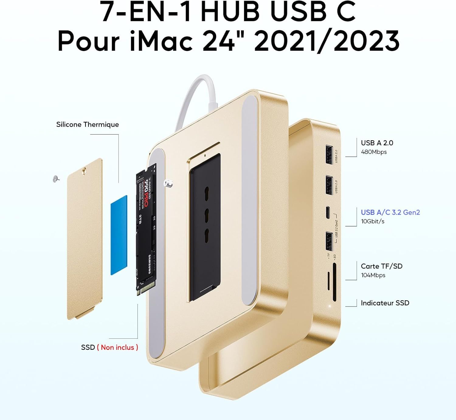 Usb C Hub Pour Imac 24 Pouces 2021/2023/2024,7 In 1 Hub Usb Pour Imac M1/M3/M4,Imac Accessoires Avec Usb C 10Gbps,3*Usb A,Sd/Tf Carte Reader,Support Expand M.2 Nvme Ssd(Non Inclus),Jaune