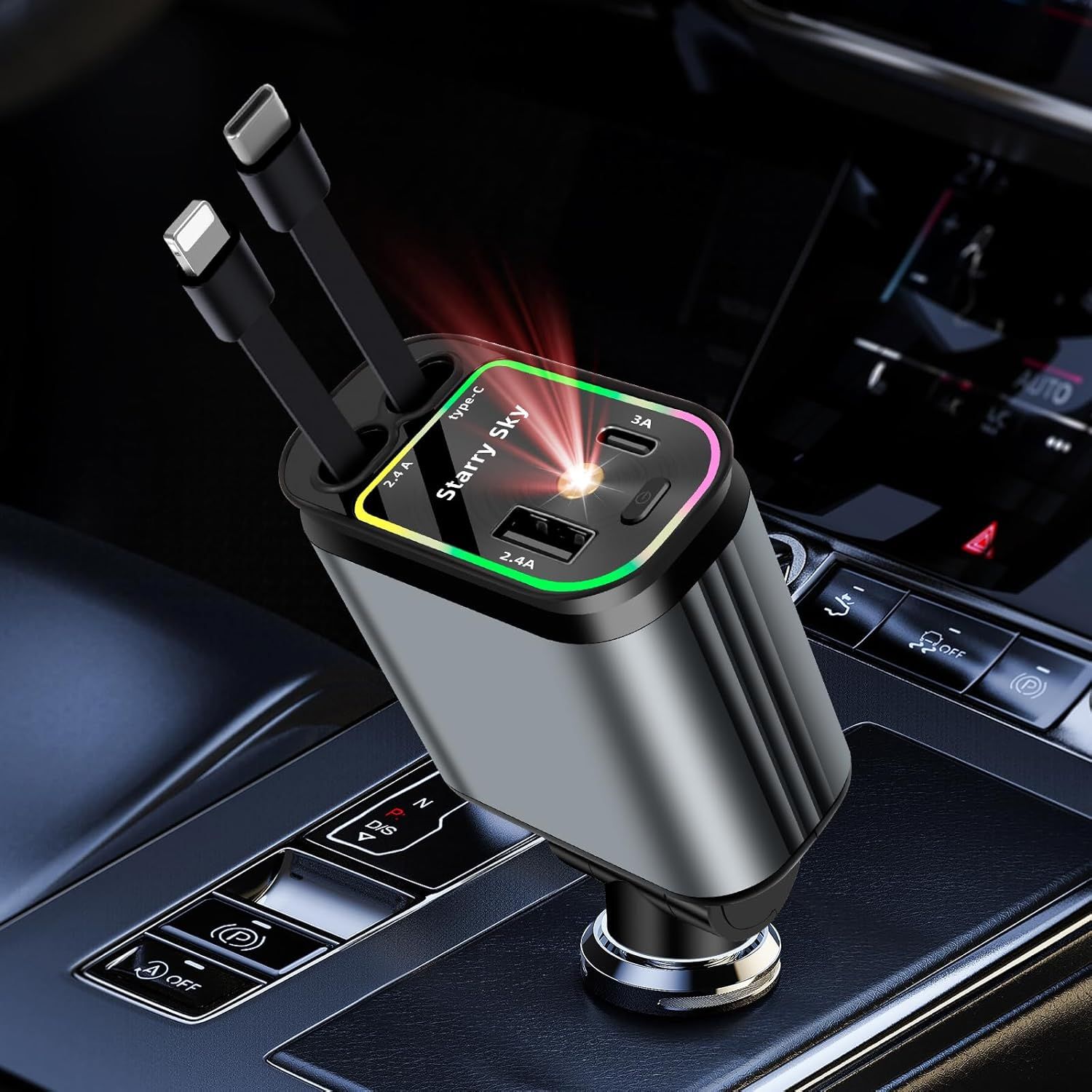Retractable Chargeur Voiture Allume Cigare USB C Chargeur de Voiture 4 en 1 à Charge Ultra Rapide Max 66 W Accessoires Voiture Interieur Compatible avec iPhone, Galaxy, Pixel, Google, Huawei etc