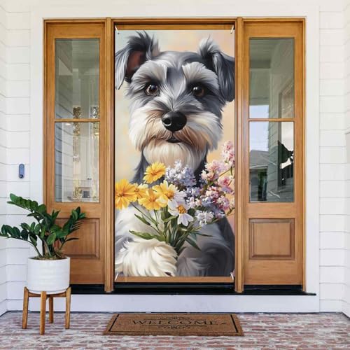 ZSUUGJ Rideau de porte réutilisable motif fleurs schnauzer pour décoration intérieure et extérieure, facile à accrocher, décoration de porte d'entrée pour fêtes, anniversaires et vacances