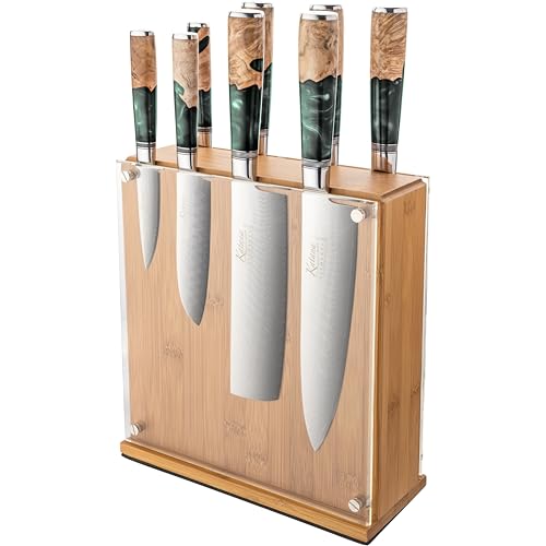Katana Saya Elements Ensemble de 9 Couteaux avec Bloc, vert forêt tropicale - Acier Damas VG-10 à haute teneur en carbone - Extrême résistance et tranchant- Manche en bois d'olivier et résine