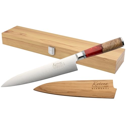 Katana Saya Elements Couteau Gyuto 20 cm, rouge volcanique - Acier Damas VG-10 à haute teneur en carbone - Extrême résistance et tranchant- Manche en bois d'olivier et résine