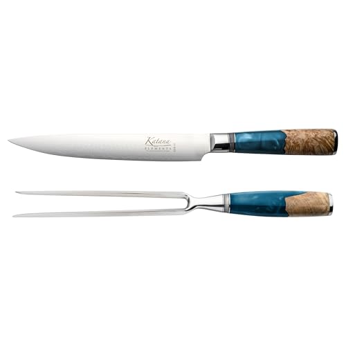 Katana Saya Elements Ensemble Couteau et Fourchette à Découper 20cm, bleu ocean - Acier Damas VG-10 à haute teneur en carbone - Extrême résistance et tranchant- Manche en bois d'olivier et résine