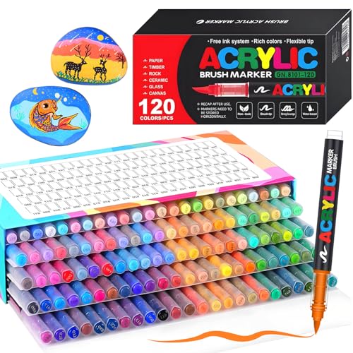 Bonala 120 Couleurs Feutre Acrylique, Acrylic Marker Pinceau pour le Feutres Coloriage Adulte,Liquide Direct Marqueur Acrylique pour Pierre,Bois,Galets,Papier, Tissu,Verre, Plastique (120 colors)