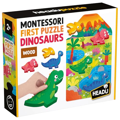 Headu - Montessori First Puzzle Dinosaurs - De Grandes Pièces Et De Grands Sujets en Bois | Puzzle Educatifs 2 3 4 Ans, Jeu Éducatif pour Enfants, Jeux Didactiques, Cadeau Enfants, Made in Italy
