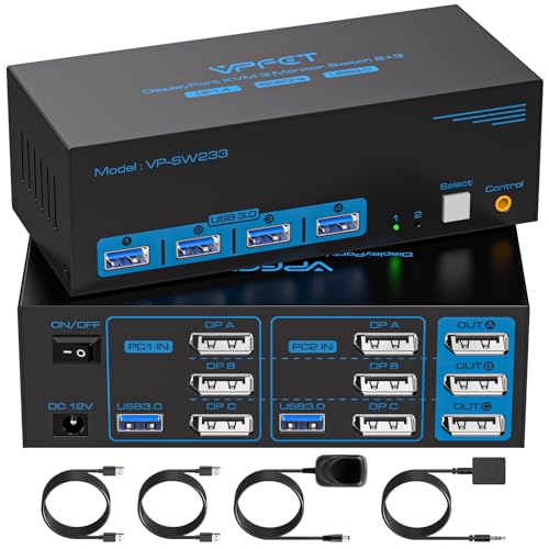 8K60Hz KVM Switch 2 PC 3 Monitor Displayport 4K120Hz USB 3.0 Commutateur KVM pour Deux Ordinateur Partager Trois Écran Avec 4 USB Port Support Extended & Copy Mode avec Adaptateur DC 12V