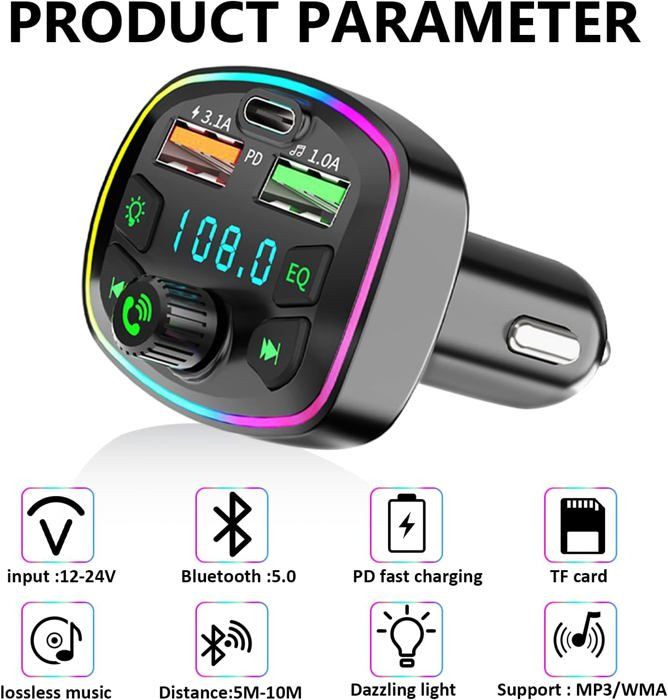 Transmetteur FM Voiture Bluetooth 5.3 Émetteur FM PD 30W QC3.0 18W Charge Rapide Kit Mains Libres Microphone RBR Anneau LED Adaptateur Allume-cigare
