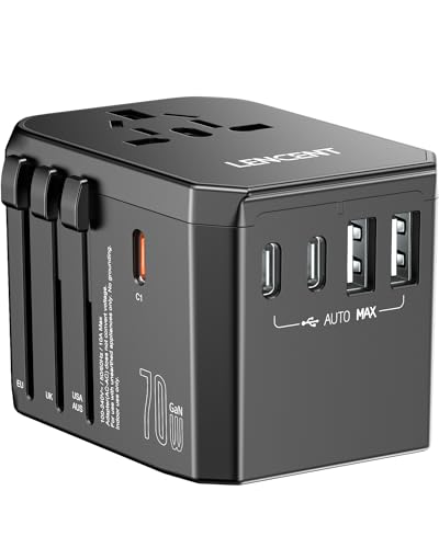 LENCENT 70W GaN Adaptateur Voyage Prise Universelle électrique 3 PD3,0 Type C+2 QC USB A Charge Rapide Chargeur International Mondial vers UK USA AUS Canada Chine Mexique Thaïlande Noir