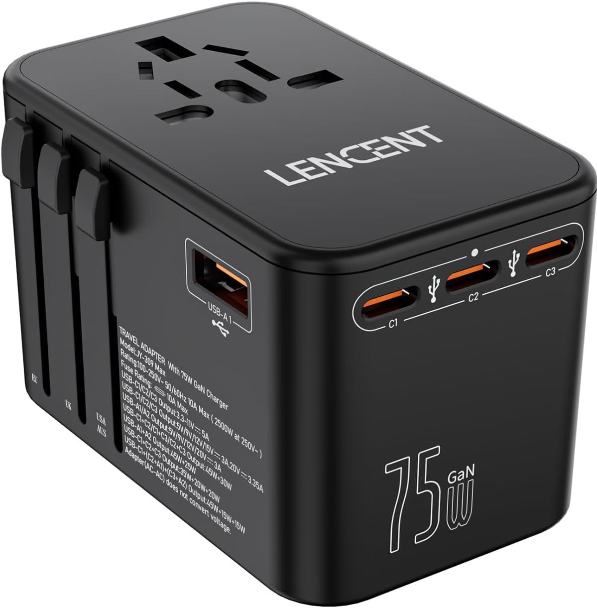 LENCENT 75W GaN Adaptateur Voyage Prise Universelle électrique 3 PD3,0 Type C+2 QC USB A Charge Rapide Chargeur International Mondial vers UK USA AUS Canada Chine Mexique Thaïlande Noir