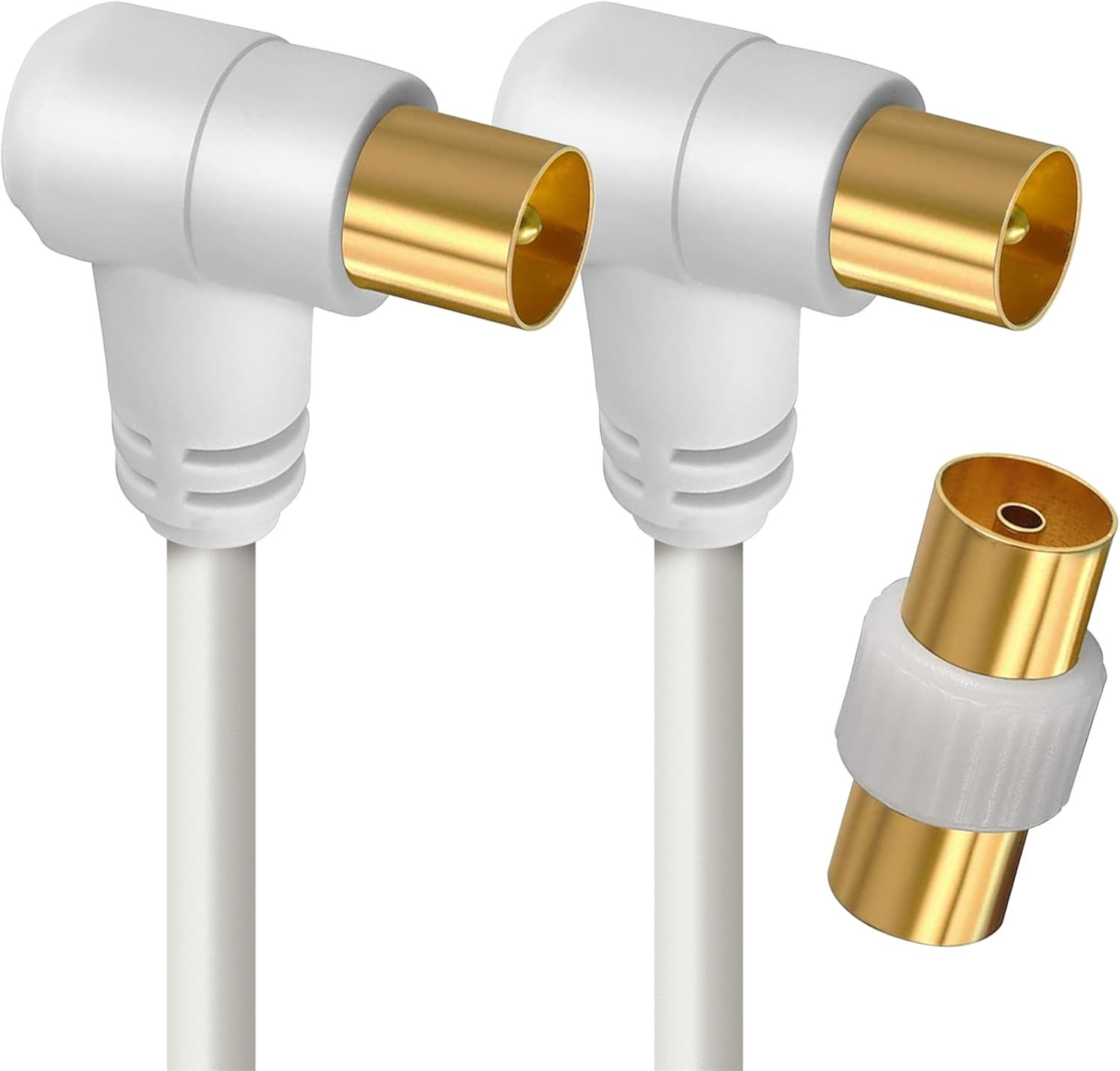 Câble TV Antenne 9.52mm,Coudé 2 Mètres,Connecteurs Gold Mâle/Mâle,Cordon Coaxial 90° Blanc avec Adaptateur Femelle/Femelle Inclus,Compatible TV Décodeur TNT Fiche Murale 9.52mm,408018(Q130)