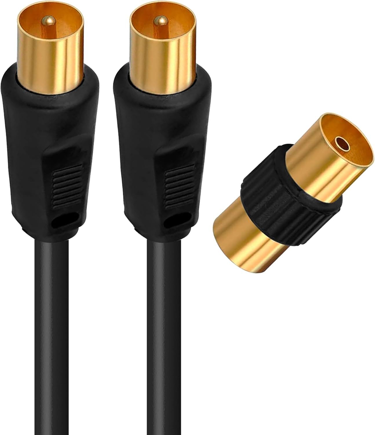 Câble TV Antenne 9.52mm,2 Mètres,Connecteurs Gold Mâle/Mâle,Cordon Coaxial Noir avec Adaptateur Femelle/Femelle Inclus,Compatible TV Décodeur TNT Fiche Murale 9.52mm,408019