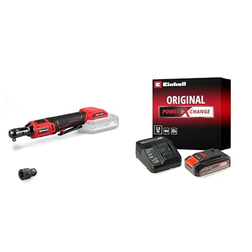 Einhell Visseuse à cliquet sans fil TE-RW 18/60 Li-Solo Power X-Change (18 V, 60 Nm, porte-outil 3/8", rotation droite/gauche, lumière LED, adaptateur 1/2 » inclus) avec Chargeur et Batterie 2,5Ah