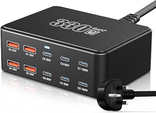 Chargeur USB multiple, GaN III 330 W, 10 ports, station de charge rapide avec 6 USB-C et 4 USB-A PD PPS 100 W, adaptateur pour ordinateur portable Mac-Book Pro/A-ir, i-Pad Pro
