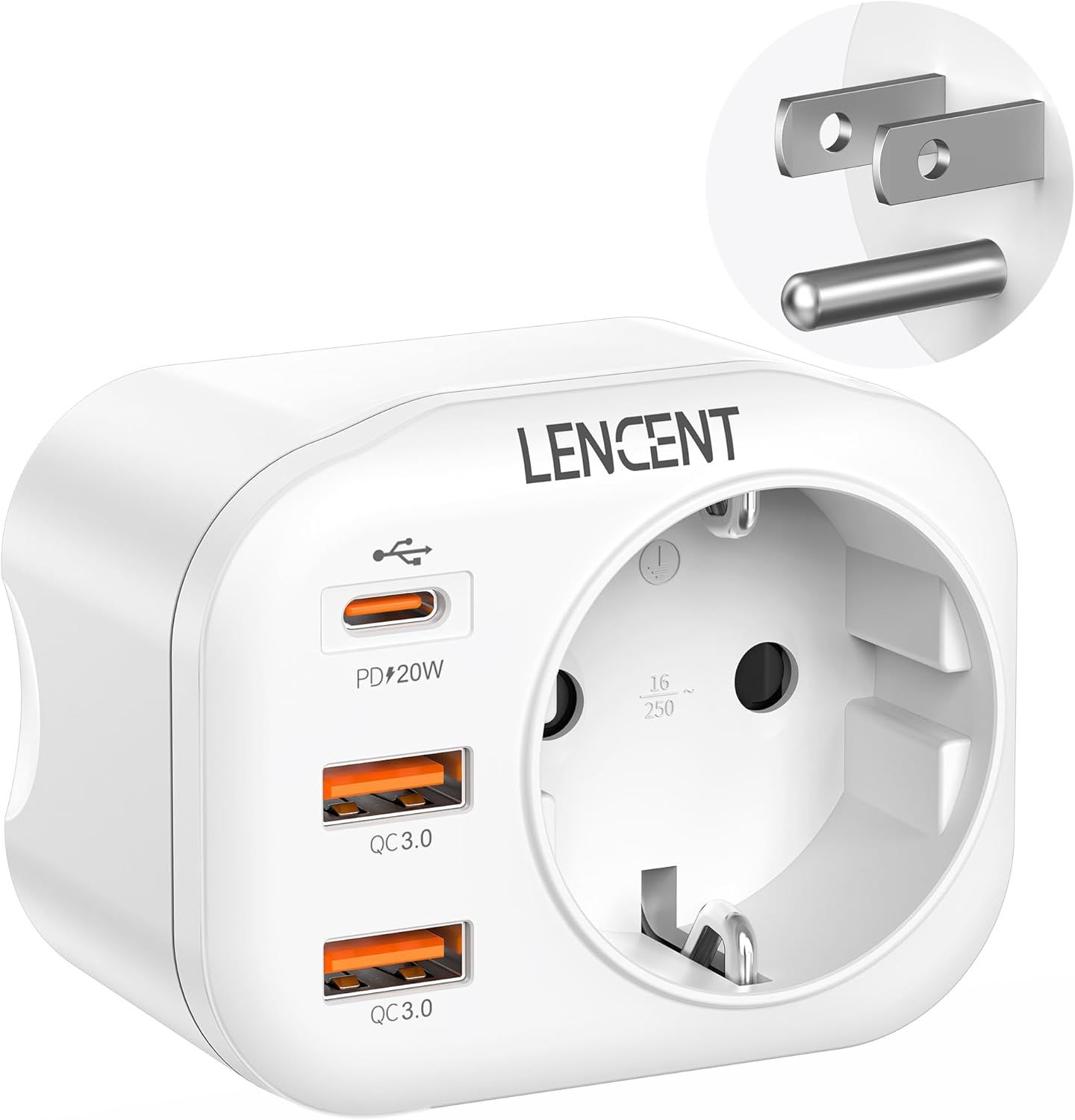LENCENT Amélioré Adaptateur Prise USA Américaine 20W PD+ QC3,0, avec 2 Ports USB et 1 Port USB-C adapté aux États-Unis Canada Mexique Thaïlande,Adaptateur électrique Mâle USA/Femelle France, Type B