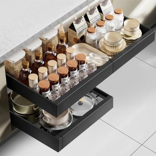 Lot de 2 Tiroir Coulissant Cuisine Adhesif: Rangement Coulissant Placard Cuisine - Plateau Coulissant à Largeur Réglable (32-53 cm L x 43 cm P x 7 cm H) - Sans perçage | Noir