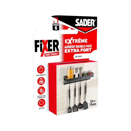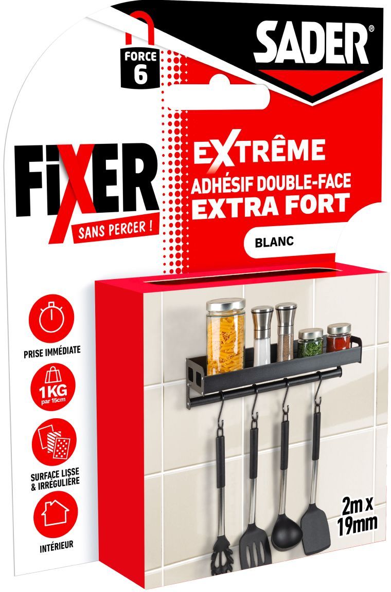 Adhésif double face extra fort - SADER - Fixer sans percer - Extrême - Intérieur - Supporte jusquà 10 Kg - Blanc - 2 m x 19 mm