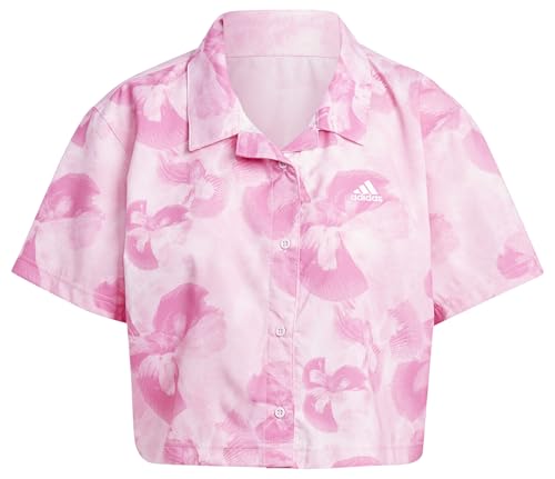 adidas Femme Floral Graphic Crop Woven Polo Shirt, Off White/Bliss Pink, L