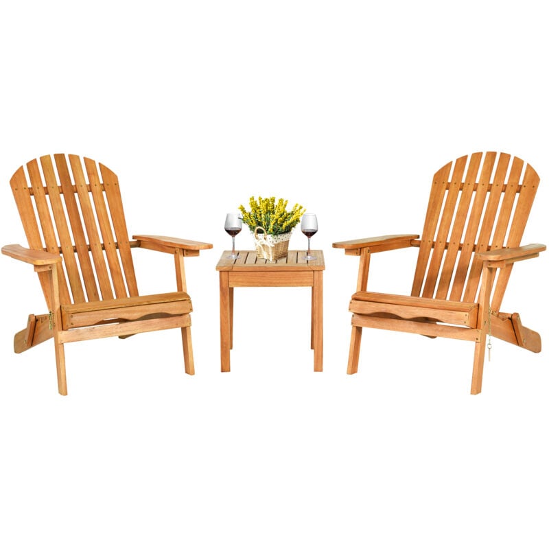 Costway - Ensemble de 3 Pièces Fauteuil Adirondack en Bois Eucalyptus et Table, Chaises Pliables avec Design à Lattes pour Jardin, Terrasse, Naturel