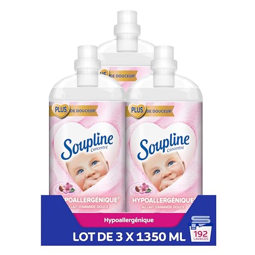 SOUPLINE Adoucissant Linge Hypoallergénique Concentré Senteur Amande Douce, Assouplissant Linge Formule Améliorée pour Plus de Douceur*, Assouplissant Textile Liquide, Soupline Lot de 3x1,35L