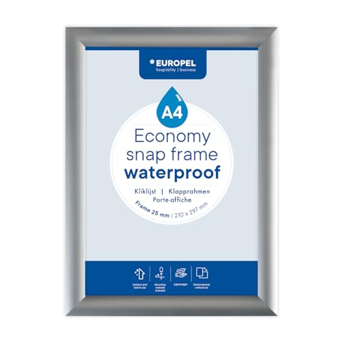 Europel Cadre clipsable Economy A4 étanche aluminium couleur argent, profil 25x11 mm, dimensions 241x328 mm, pour affiche de 21x29,7 cm, porte-affiche, hôtel, bureau, restaurant, menus, réclame,