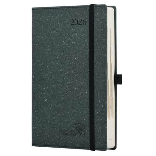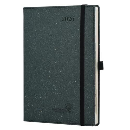 POPRUN Agenda 2026 A5 Journalier 21,5 x 14,5 cm - Couverture rigide Écologique biodégradable, 1 Page par Jour, D'Jan 2026 à Déc 2026, Signet à 2 rubans, Papier 80 g/m², Noir Gris