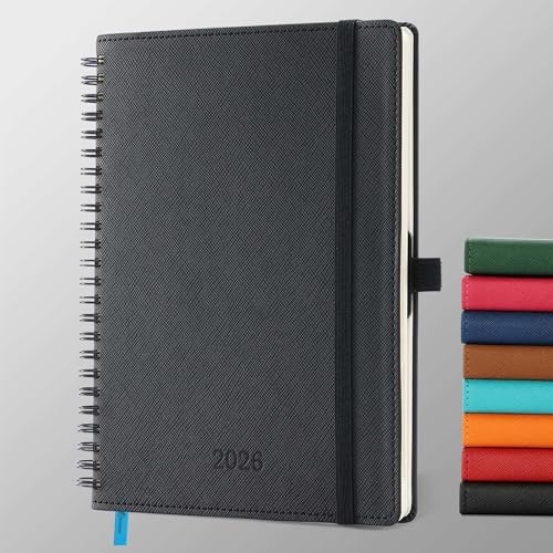 POPRUN Agenda 2026 Semainier et Carnet de Notes Moyen 22 x 16,5 cm - Couverture Spirale en Cuir Weekly Planner D'Jan 2026 à Déc 2026, Onglets Mensuels, Papier 100 g/m², Noir