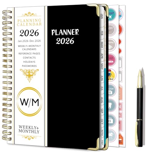 NEYSA Agenda 2026 Semainier Spirale de Janvier à Décembre (12 mois) A5 Agenda Scolaire semainier et mensuel Avec Autocollants de plan, Stylo,Onglets Mensuels, pochette (Noir)